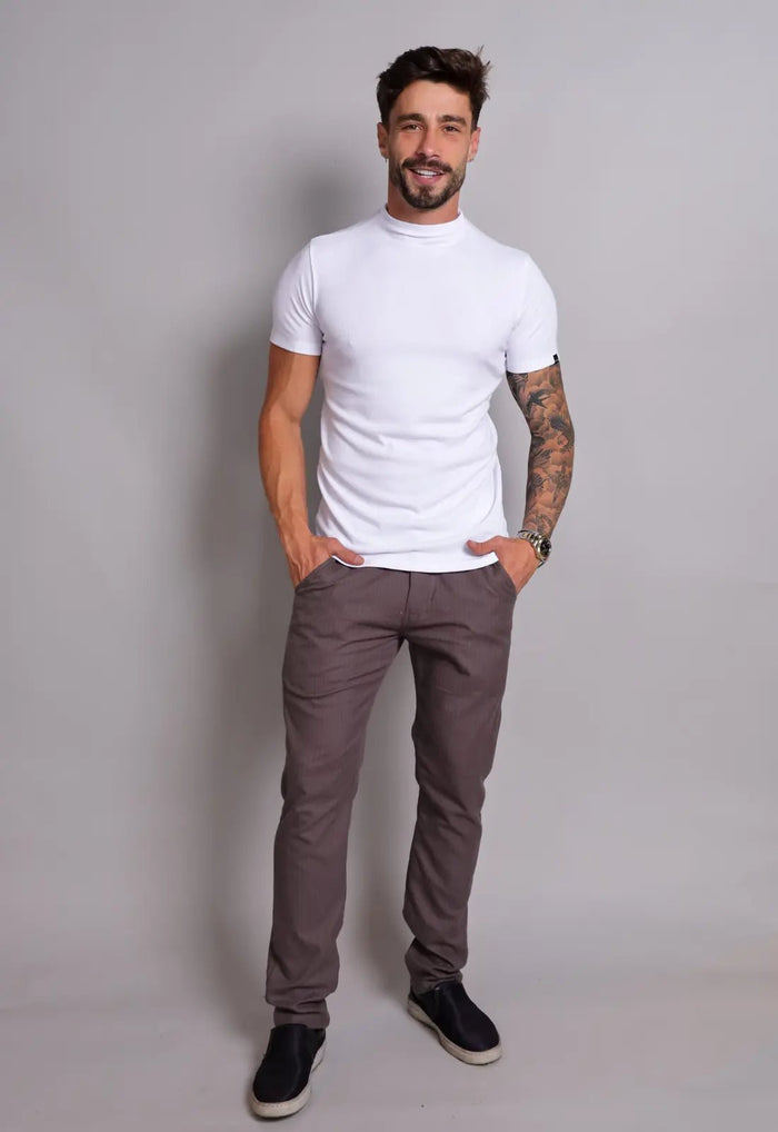 Seja o centro das atenções com uma peça que une elegância e conforto. Esta Camiseta Masculina Gola Média Branca, com modelagem slim fit, oferece um caimento moderno e ajustado ao corpo, ideal para quem busca um visual sofisticado e ao mesmo tempo versátil. A gola média adiciona um toque de estilo que eleva qualquer combinação.